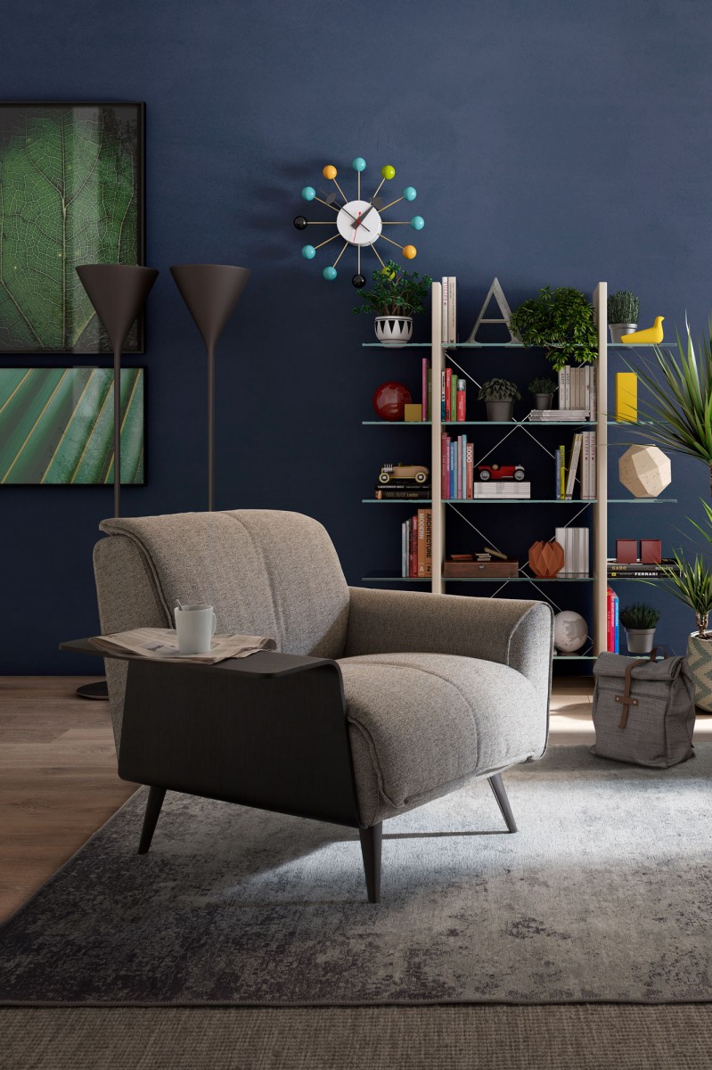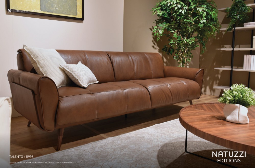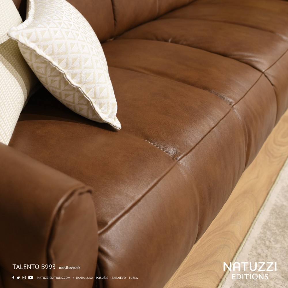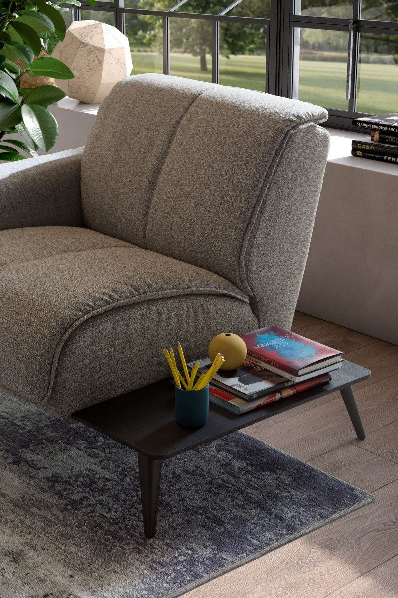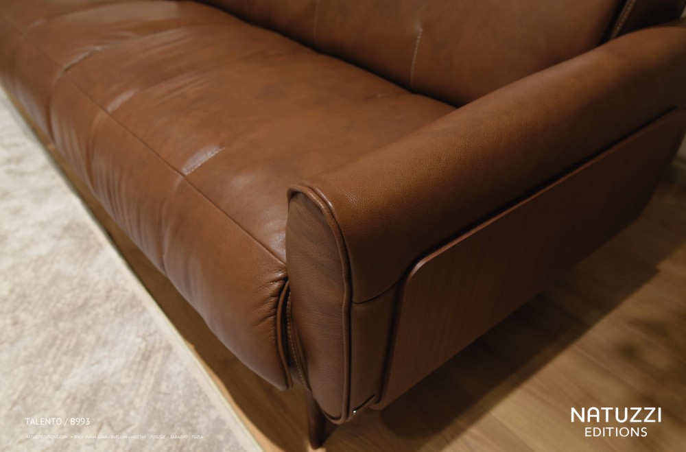 Ein Talento-Modell mit einzigartigem Retro-Design mit geschwungenen Holzseiten und hohen Beinen. Die Armlehnen sind ebenfalls mit Holzplatten verziert. Jedes Detail ist Teil eines sehr einzigartigen Stils.