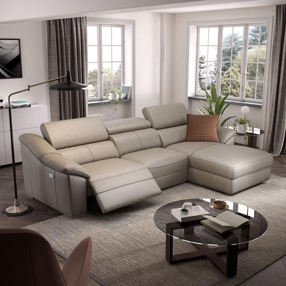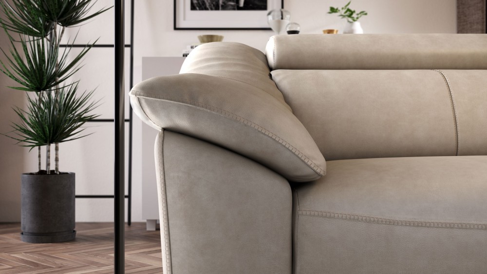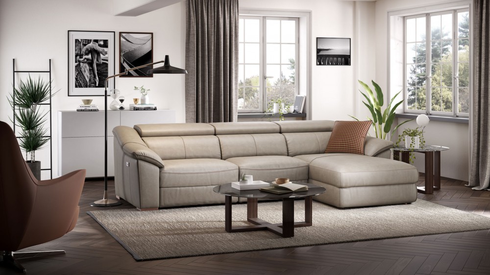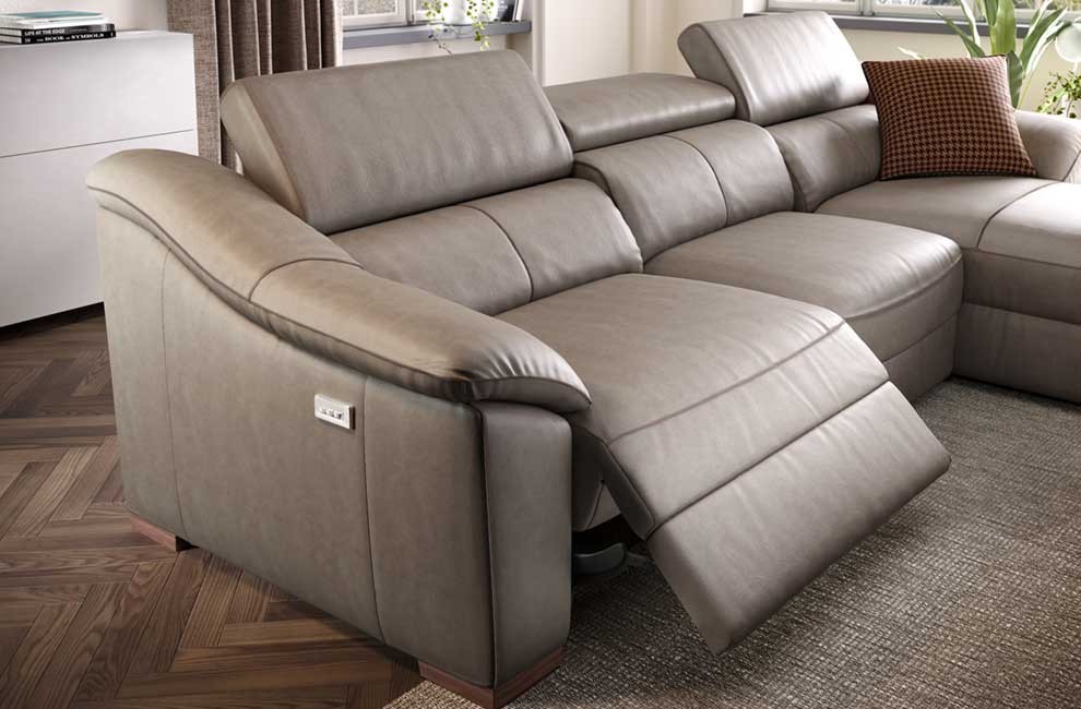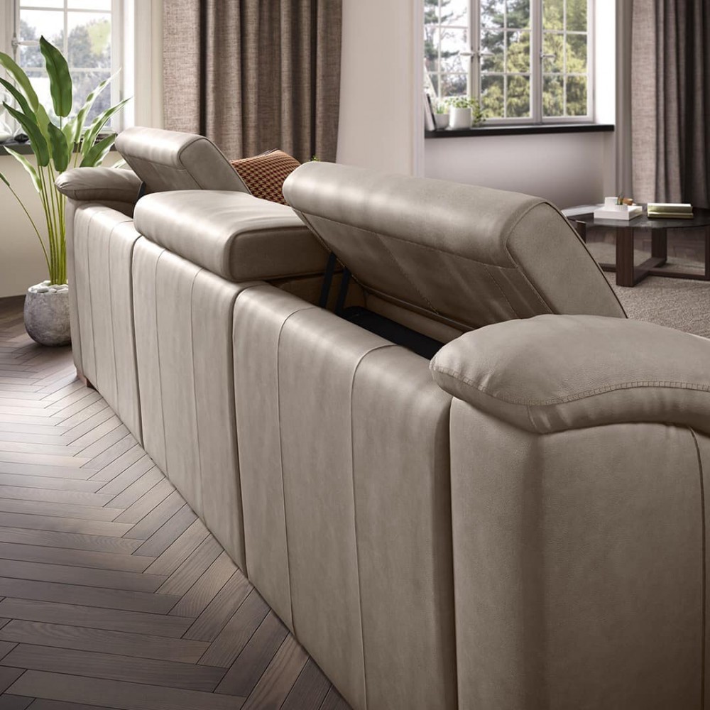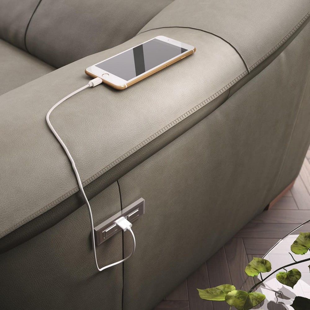 Das Sofa Emozione kann mit einem elektrischen Entspannungssystem ausgestattet werden. Mit dem platzsparenden Zero Wall-System können Sie das Sofa aufklappen, ohne es von der Wand wegzubewegen. Der Smart Switch an der Seitenwand ist auch mit einem USB-Anschluss ausgestattet, an dem Sie beispielsweise Ihr Telefon aufladen können.
