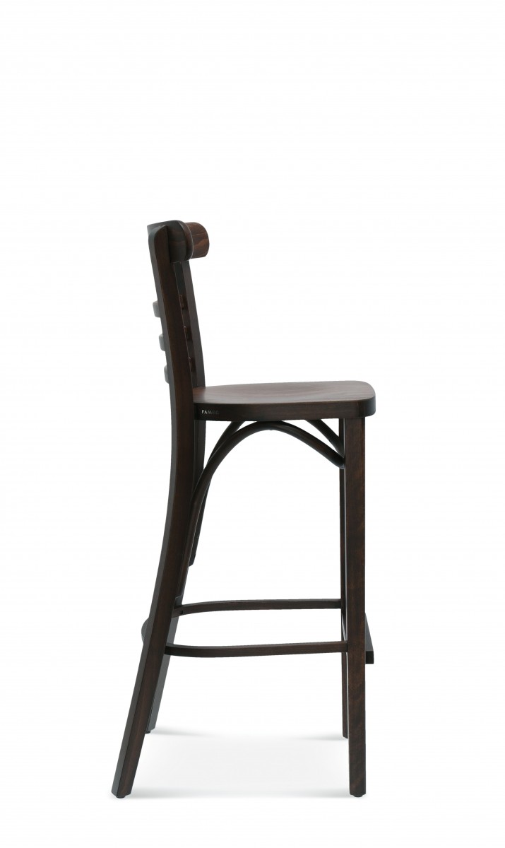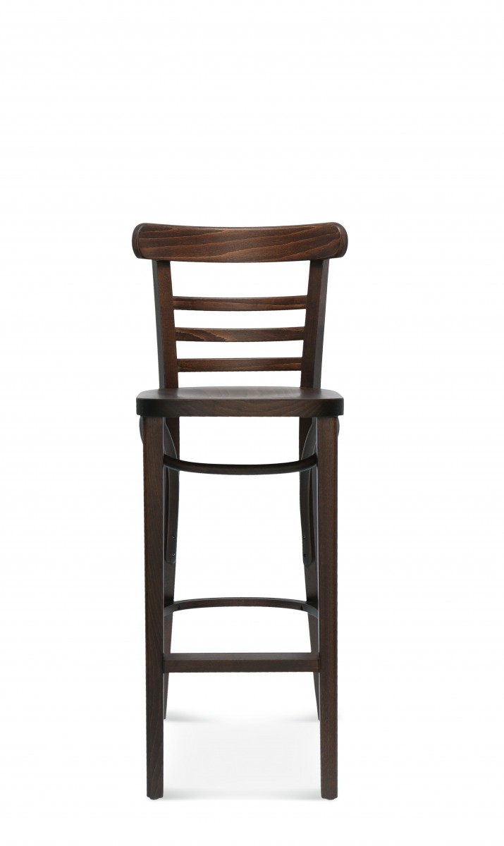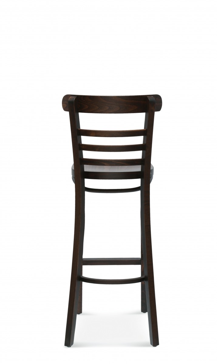 Eine klassische und sehr beliebte Form eines Barstuhls aus Holz mit drei horizontalen Sperrholzlatten, die die Rückenlehne füllen.