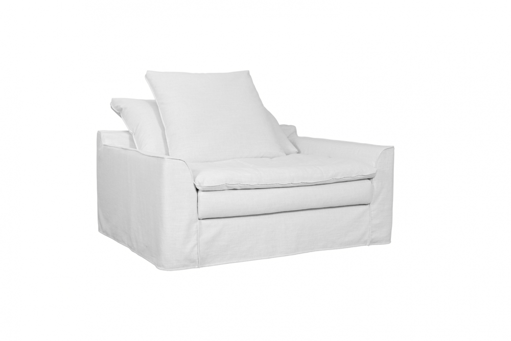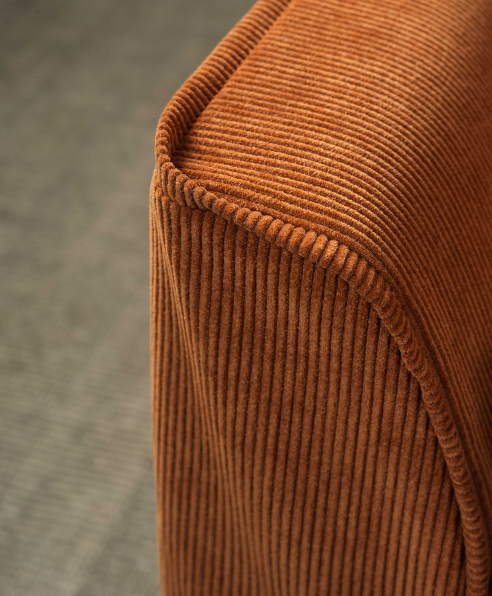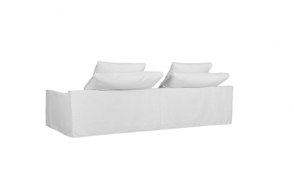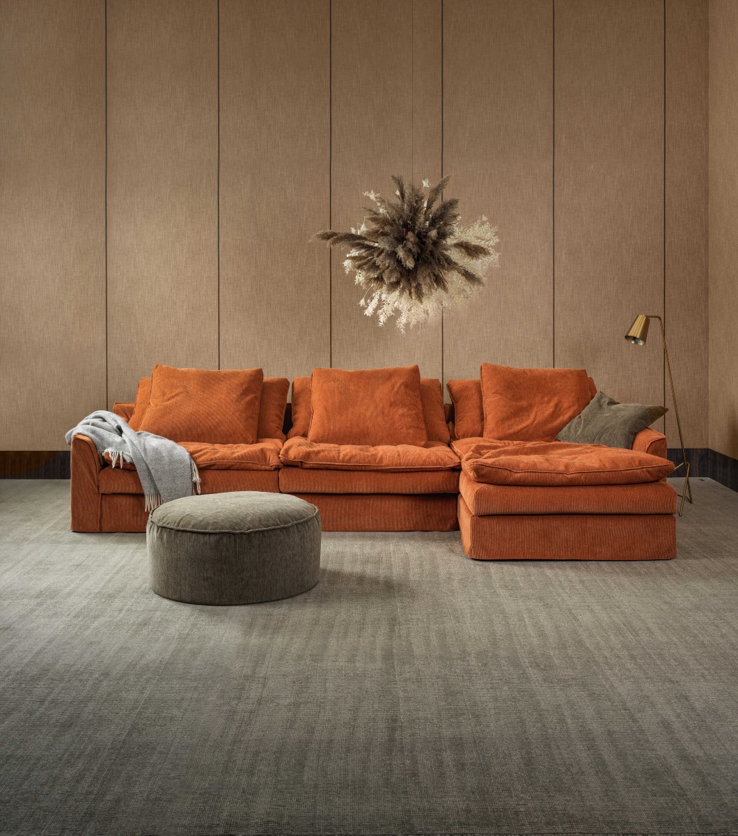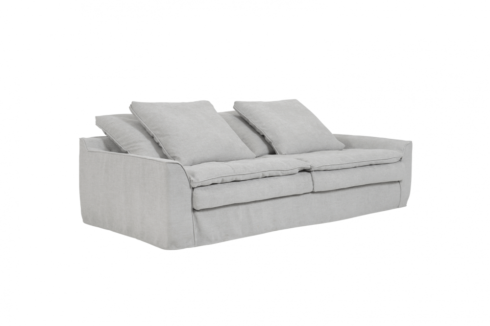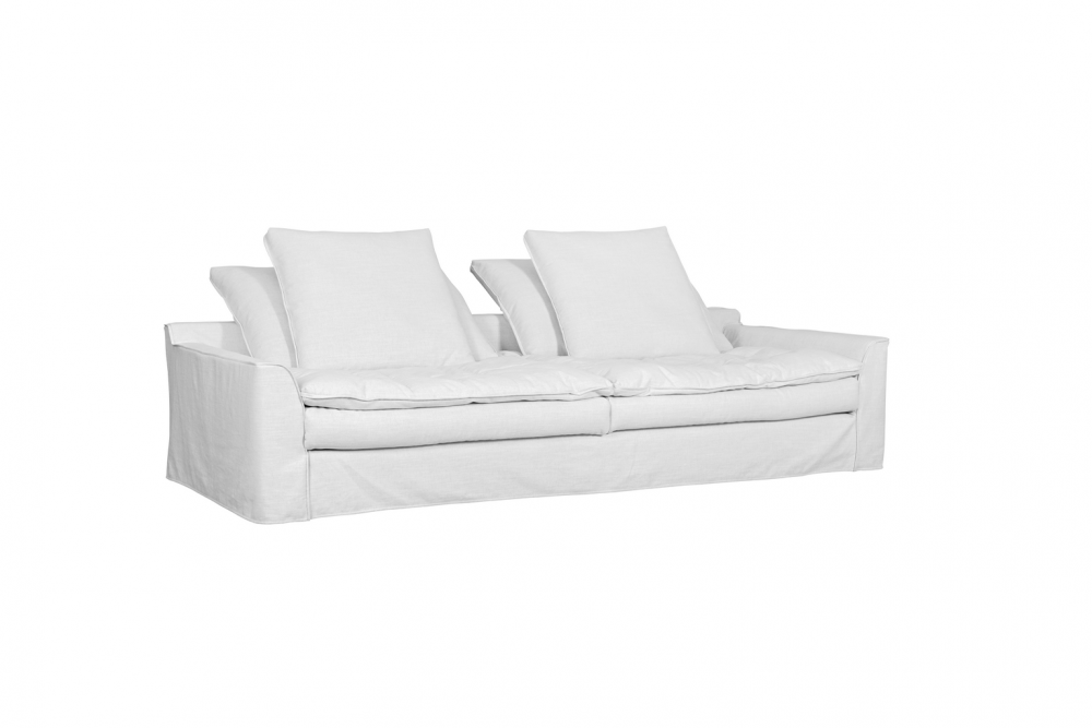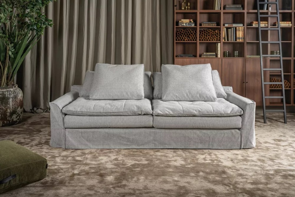 Sake LC, ein Sofa mit losem Stoffbezug. Es ist ein Möbelstück, das am besten durch Werte wie Rebellion, Freiheit und Kreativität beschrieben wird. Warum? Die schlichte Form der Basis schafft einen lässigen Hintergrund für vier Kissen (zwei größere, zwei kleinere), die sich frei auf dem Sofa ausbreiten und unbeschwert ruhen lassen